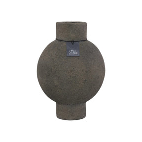 Dankzij de compacte afmetingen – 34 cm hoog, 20 cm breed en 16 cm diep – komt deze vaas prachtig tot zijn recht op een vensterbank, een ondiep dressoir of als stijlvol accent op een plank. De vaas is niet helemaal bol, maar heeft een ovale/platte vorm wat zorgt voor een moderne uitstraling, terwijl het aardewerk een warme, ambachtelijke sfeer toevoegt aan elke ruimte.